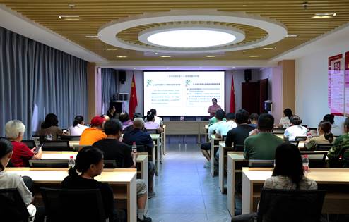 二楼会议室里,韩慧兰博士以“体育锻炼对老年人康养的影响研究”为主题,为社区老年人开展运动知识专题讲座。韩博士从运动方式选择、对老年人身心影响等方面为老人们进行了深入浅出的讲解,并现场演示热身、有氧、抗阻、伸展等运动方式,将科学锻炼的理念和方法传授给现场听众。