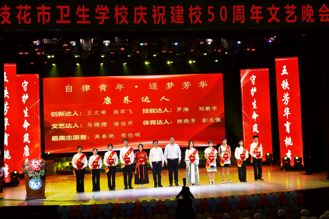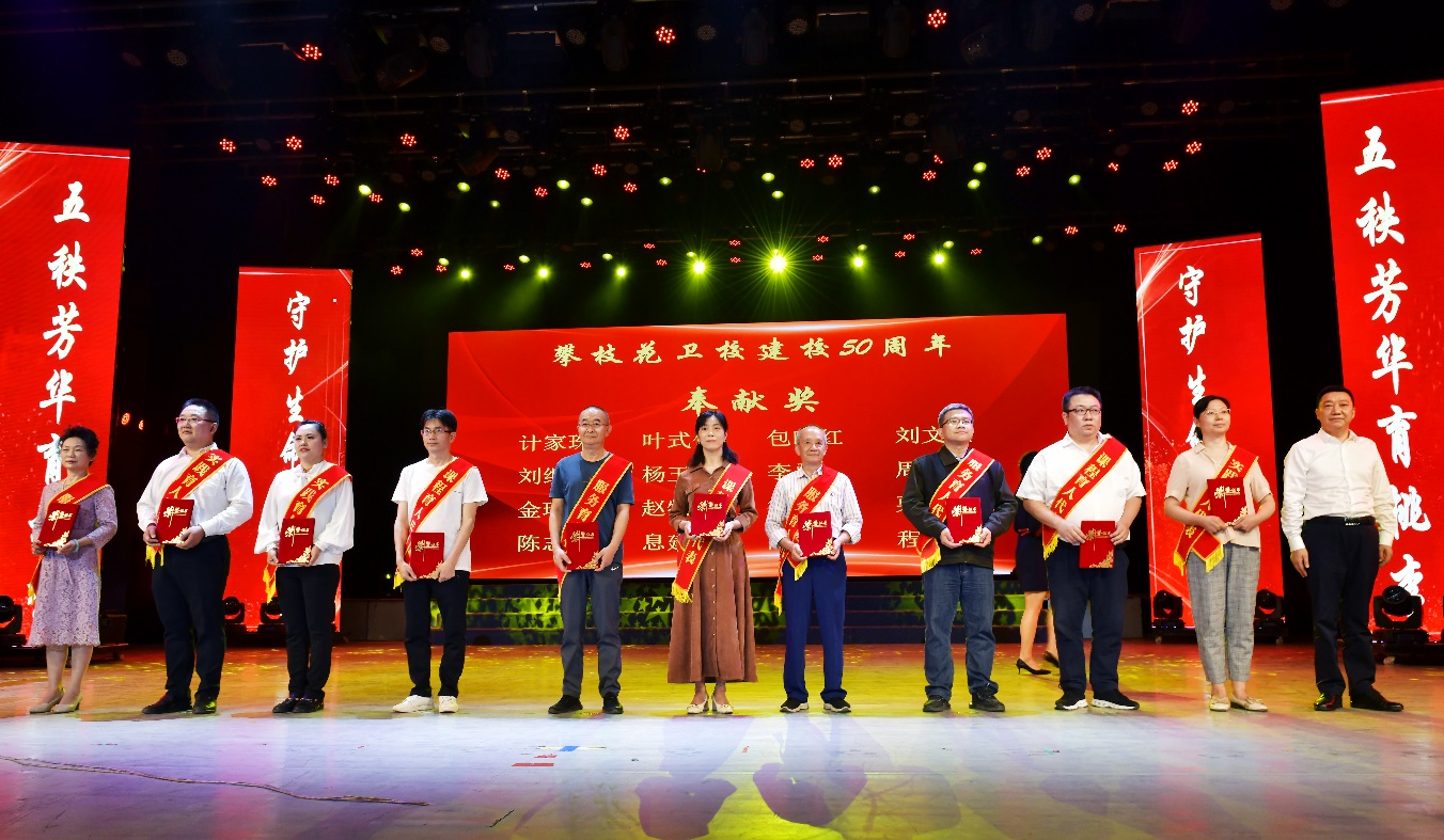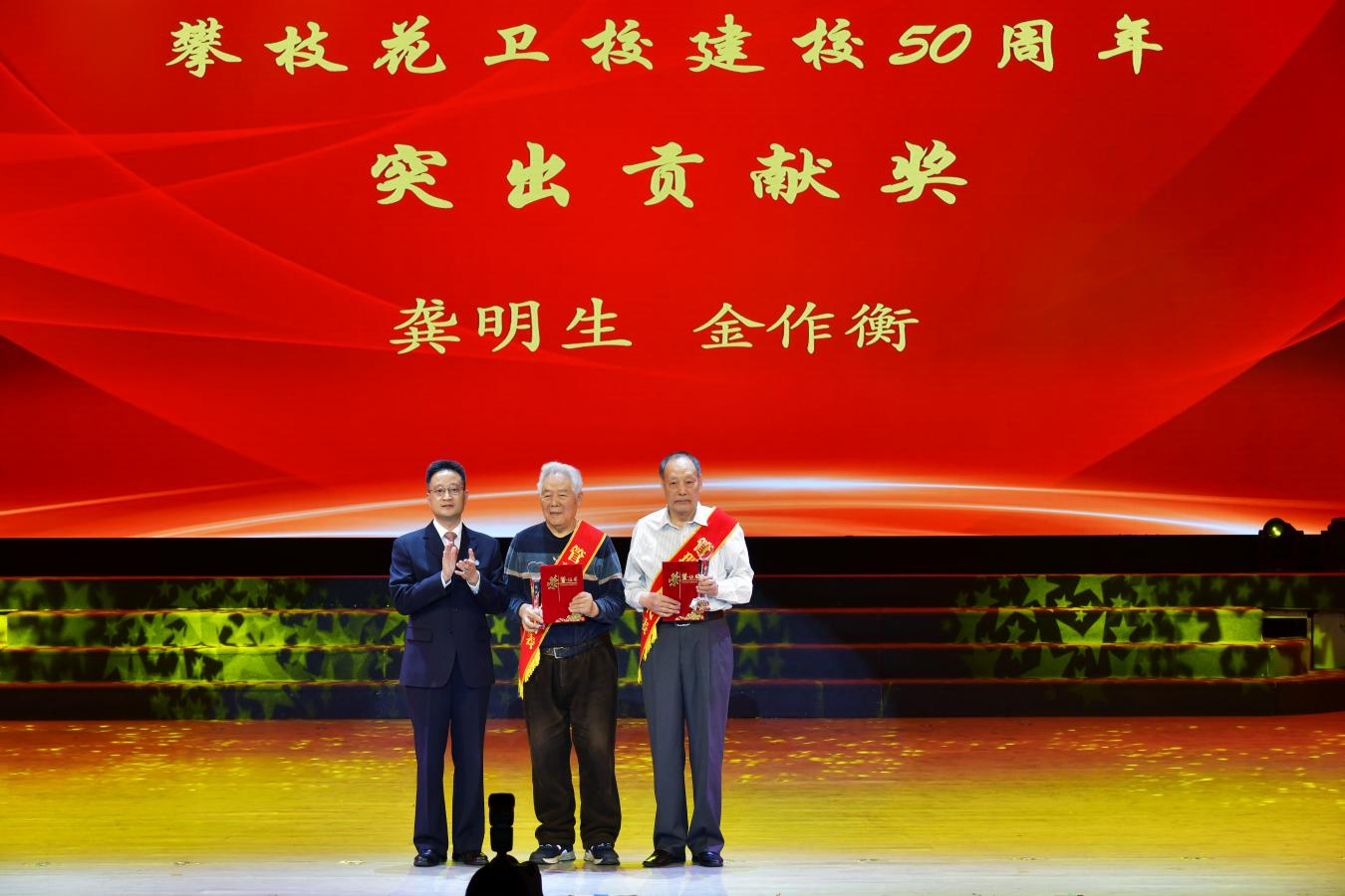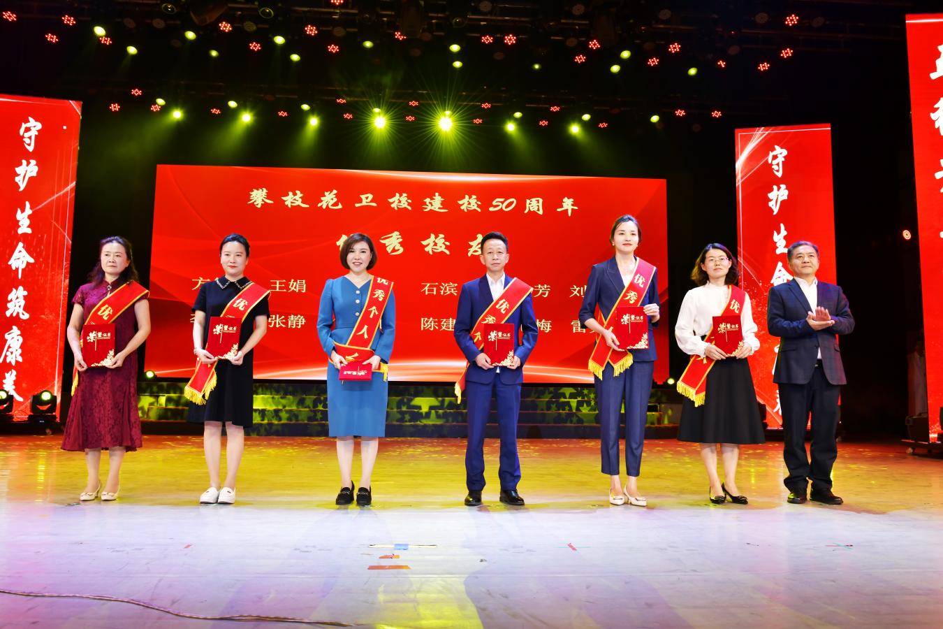 为表彰先进、感恩奉献,大会进行了“50年50人”表彰颁奖活动。首先由林伟书记宣读了关于《攀枝花市卫生公司建校50周年表彰决定》,授予龚明生、金作衡等2名同志“突出贡献奖”荣誉称号,由王斌书记上台颁奖。并授予16名同志“奉献奖”荣誉称号、12名同志“优秀员工”荣誉称号、10名同学“自律之星”荣誉称号、10名同学“康养达人”荣誉称号,会上对获奖代表进行了颁奖。继之,副董事长王兵领誓“攀大教师自律誓词”,全场攀大教师庄严宣誓,来宾和员工见证教师的铮铮誓言。