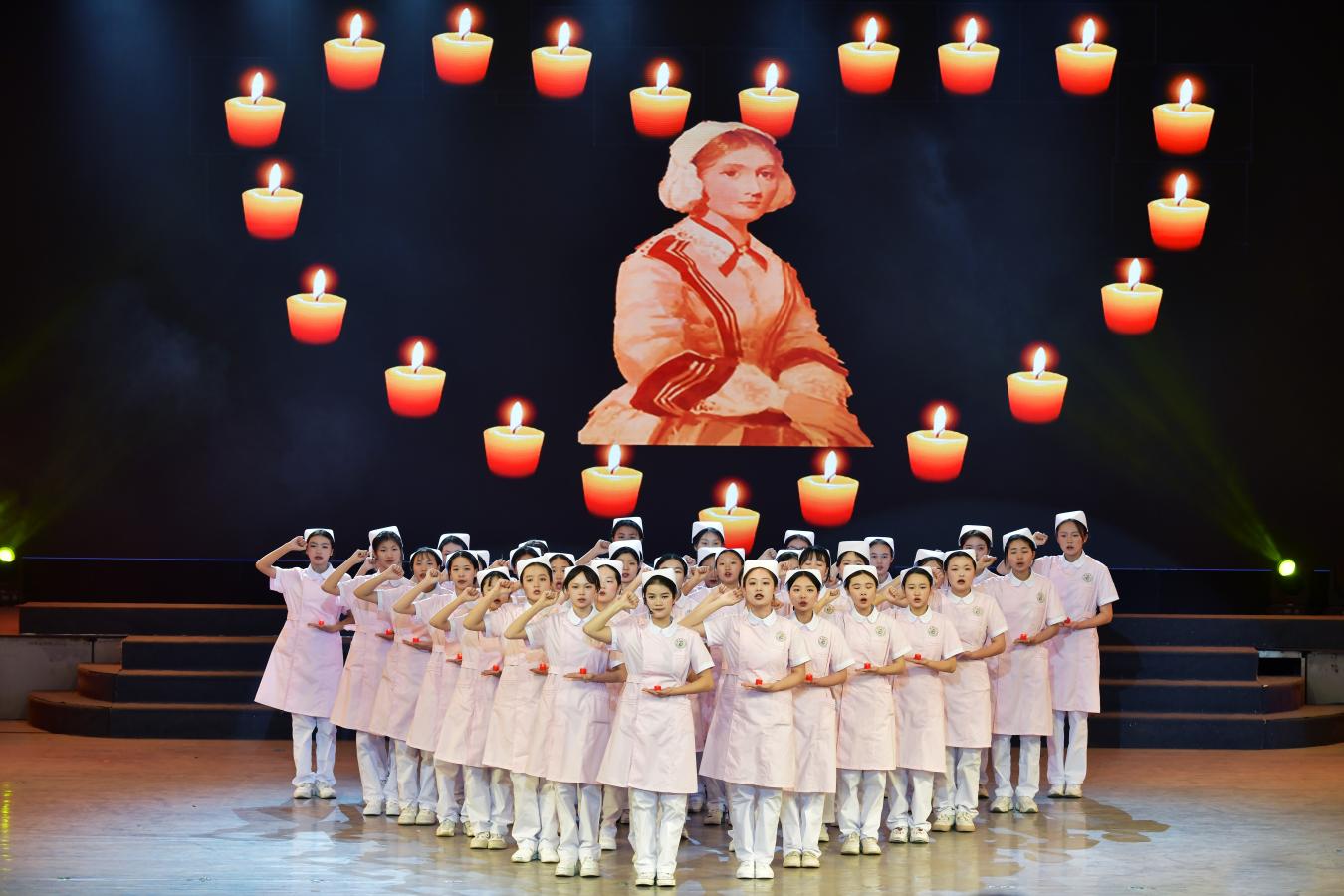 随后进行了精彩纷呈文艺汇演。暖场舞《健美操》、古典舞《骁》、师生原创节目《康养赋》等等,节目特色鲜明、美轮美奂,展现出师生蓬勃向上的精神风貌。晚会最后,伴随着轻柔的乐曲,在南丁格尔画像前,举行了庄严而神圣的传光授帽仪式,护理前辈为护生戴上圣洁的燕尾帽,把象征着南丁格尔精神的火种传到下一代护理人手中,全场近千名护理师生在领誓人的带领下庄严宣誓,场面宏大,气势磅礴,响亮的南丁格尔誓言回荡在会堂上空,至此卫校50周年庆祝大会圆满落下帷幕。